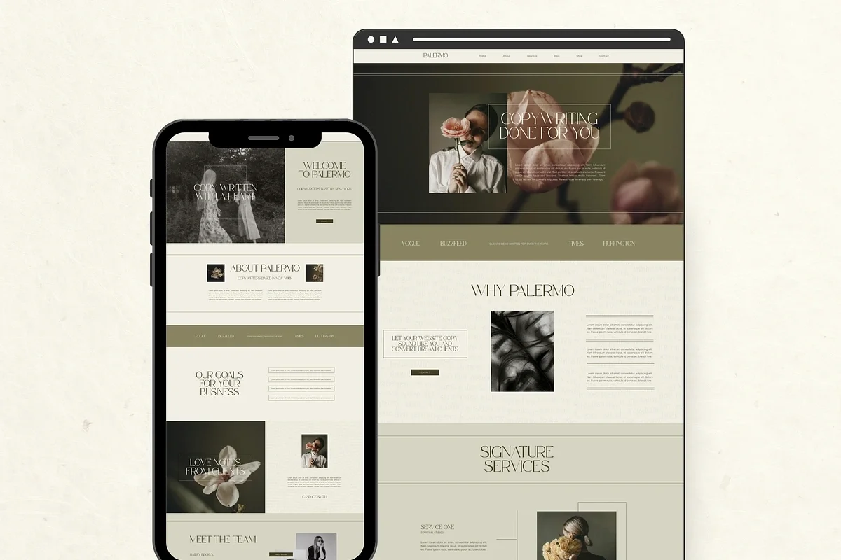 Complete set of slides with logos and the visual system tested on mockups: homepage sections, social posts, and branding (or substitute items that fit your business). Ready to present and show off your new brand.